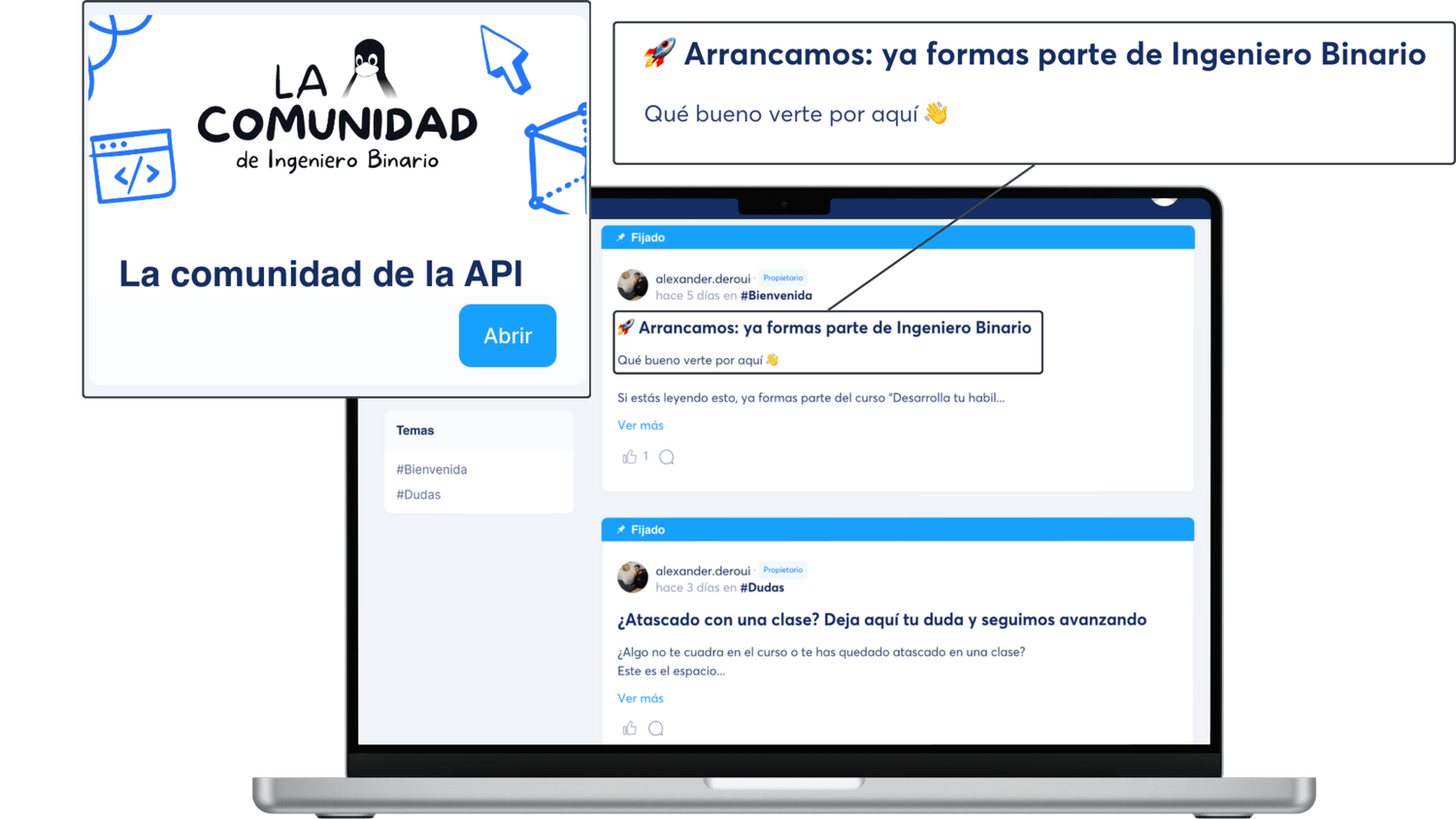 Durante todo el proceso tendrás acceso a la Comunidad de Ingeniero Binario, donde podrás compartir tus dudas, ver cómo otros compañeros resuelven las suyas y aprender en conjunto. También dispondrás de una sesión semanal en directo con Alexander para recibir orientación y mantener el rumbo.